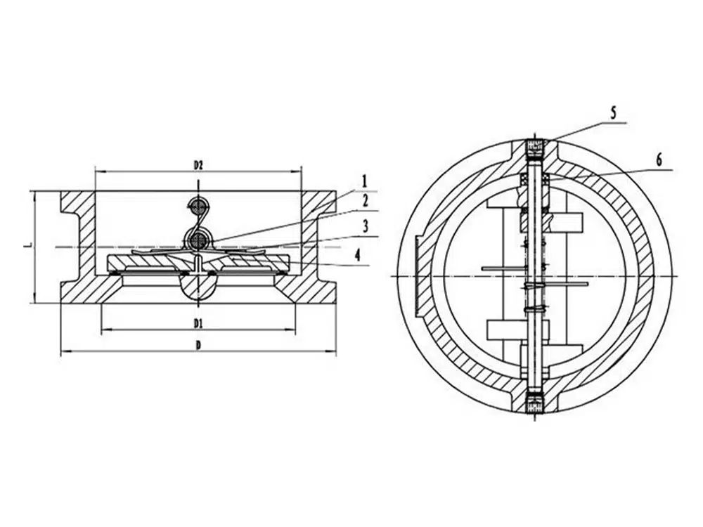 DH77X型对夹式蝶形止回阀由阀体、阀瓣、阀杆及弹簧等零件组成,采用对夹连接。由于阀瓣的关闭行程短,并且有弹簧加载,可显著减少水锤现象。该止回阀主要适用于城市、工业及高层建筑给水、排水管网上。由于其结构长度比一般止回阀短,对有安装空间限制的场所最为适用。对夹式蝶形止回阀用于纯净管路及工业、环保、水处理、高层建筑给排水管路,阻止介质逆向流动之用。
