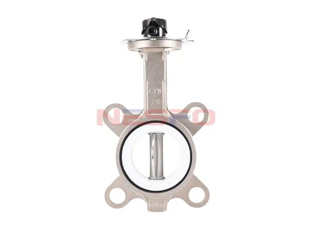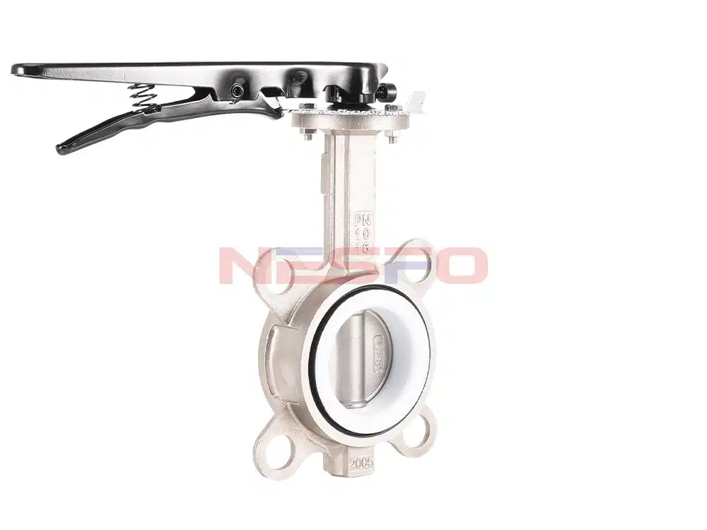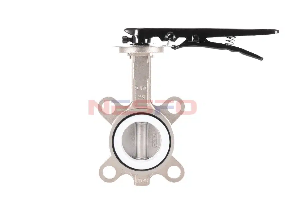D71F-16P手柄对夹四氟蝶阀可适用于食品、医药、化工等净管路及工业环保、水处理、高层建筑、给排水管路作启闭或调节介质流量之用。对夹四氟蝶阀的蝶板安装于管道的直径方向。在蝶阀阀体圆柱形通道内,圆盘形蝶板绕着轴线旋转,旋转角度为0°~90°之间,旋转到90°时,阀门则呈全开状态。