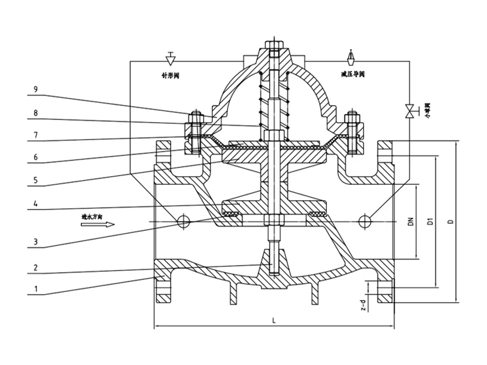 When the valve is fed from the inlet side, water flows through the needle valve into the main valve control chamber and outlet pressure is applied to the pilot valve through the conduit. When the outlet pressure is higher than the spring setting of the pilot valve, the pilot valve closes. The control chamber stops draining, at which time the pressure in the main valve control chamber rises and closes the main valve, and the outlet pressure no longer rises. When the valve outlet pressure drops to the pilot valve spring setting pressure, the pilot valve opens and the control chamber drains downstream. As the pilot valve system drains more water than the needle valve inlet, the pressure in the main valve control chamber drops. The inlet pressure causes the main valve to open. In the steady state, the control chamber inlet and discharge are the same, the main valve opening is constant, and the outlet pressure is stable. The outlet pressure can be set by adjusting the pilot valve spring.