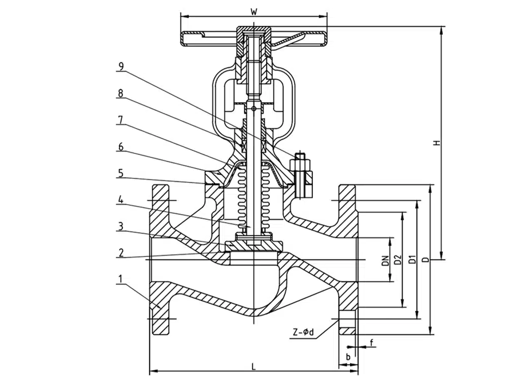 DN | L | D | D1 | D2 | b | f | W | H | z-∅d |