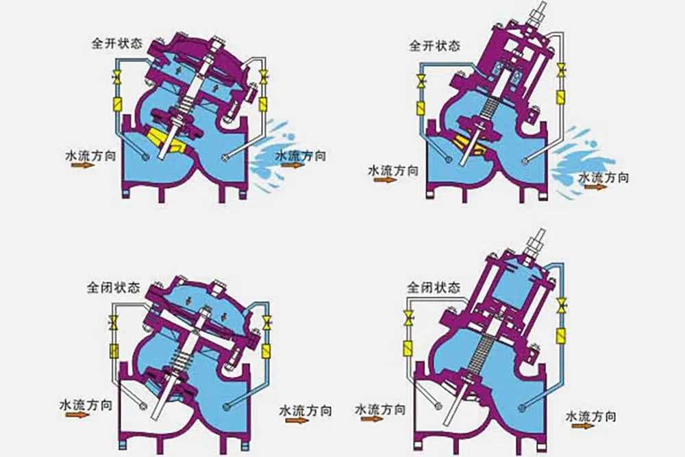 当水泵启动后,阀门进水口压力上升,压力水一方面推动主阀板开启,另一方面通过导管系统进入膜片(活塞)下腔,而膜片(活塞)上腔的水通过导管系统泄入压力低的阀门出水口,而阀门在二合力的作用下缓慢开启。