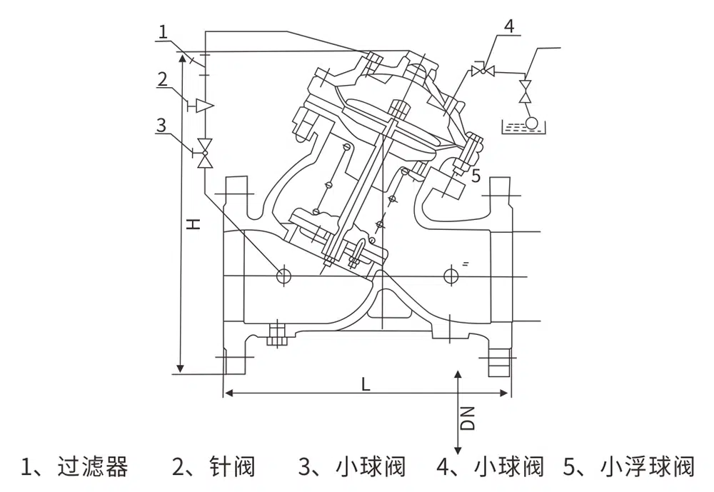 F745X多功能遥控浮球阀是兼具多种功能的水力操作式阀门。主要安装于水池或高架水塔的进水口处,当水位达到设定的高度时,主阀由浮球导阀控制关闭进水口停止供水;当水位下降后,主阀由浮球导阀控制打开进水口向水池注水,实现自动补水。液位控制准确,不受水压干扰;遥控浮球阀可随水池的高度及使用空间任意位置安装,维护、调试、检查方便、密封可靠,使用寿命长。