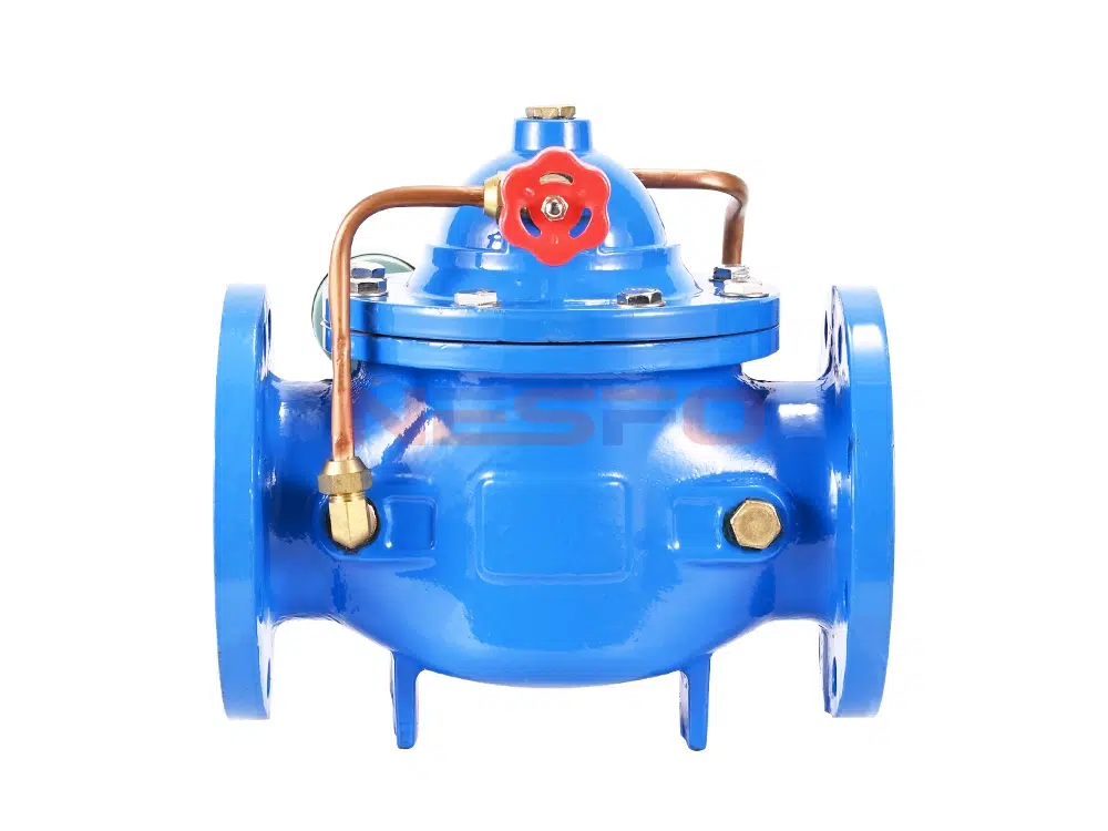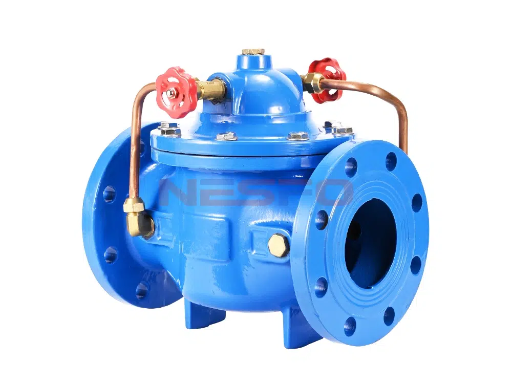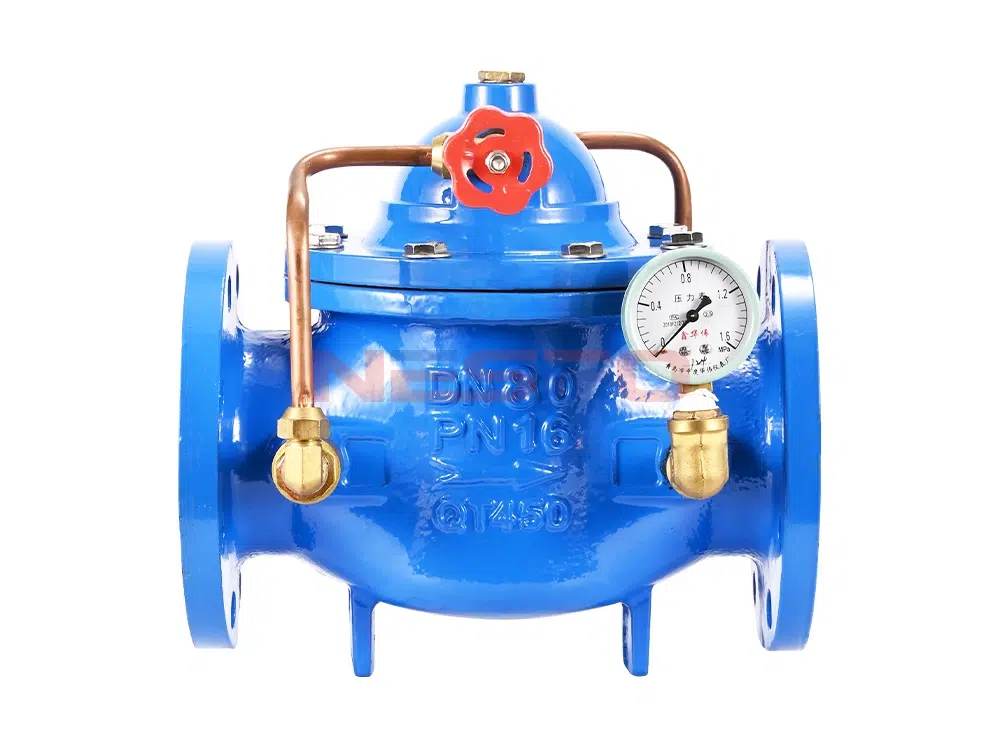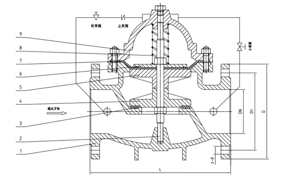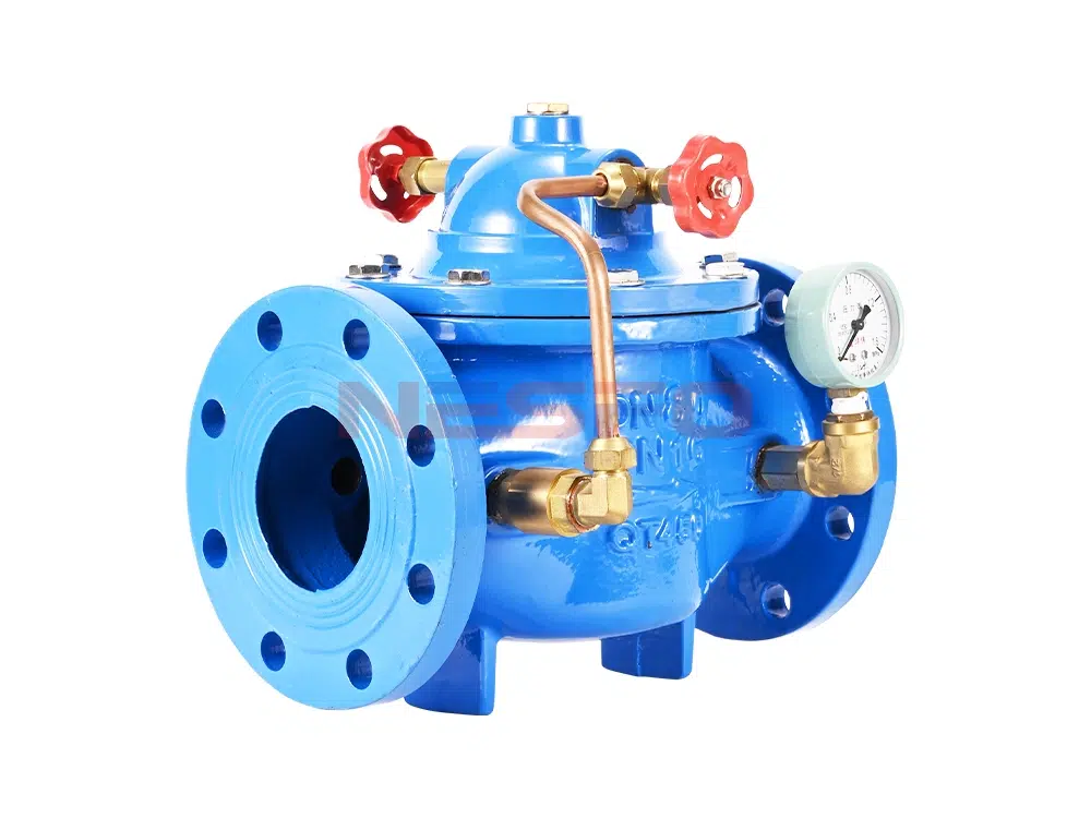 300X slow closing check valve consists of main valve, check valve, needle valve, ball valve, micro filter and pressure gauge to form a hydraulic control receiver system. Utilizing hydraulic automatic operation, it can make the main valve get rapid opening or slow closing speed. Prevent the generation of water clock water strike to achieve the effect of slow closing muffling. When the slow-closing check valve feeds water from the inlet end, the water enters the main valve control room through the micro-filter, needle valve and check valve, and then drains to the downstream through the ball valve. Because the needle valve opening is smaller than the ball valve opening, that is, the main valve control room drainage rate is greater than the rate of water intake, so the control room pressure is reduced, acting on the lower end of the main valve disk inlet pressure to open the main valve to the downstream water supply. When the pipeline stops supplying water, if the downstream water begins to flow back, a part of the backflow water through the ball valve into the main control room, due to the check valve, the backflow water can not flow out of the main control room, causing the main control room gradually increase pressure, slowly close the main valve.