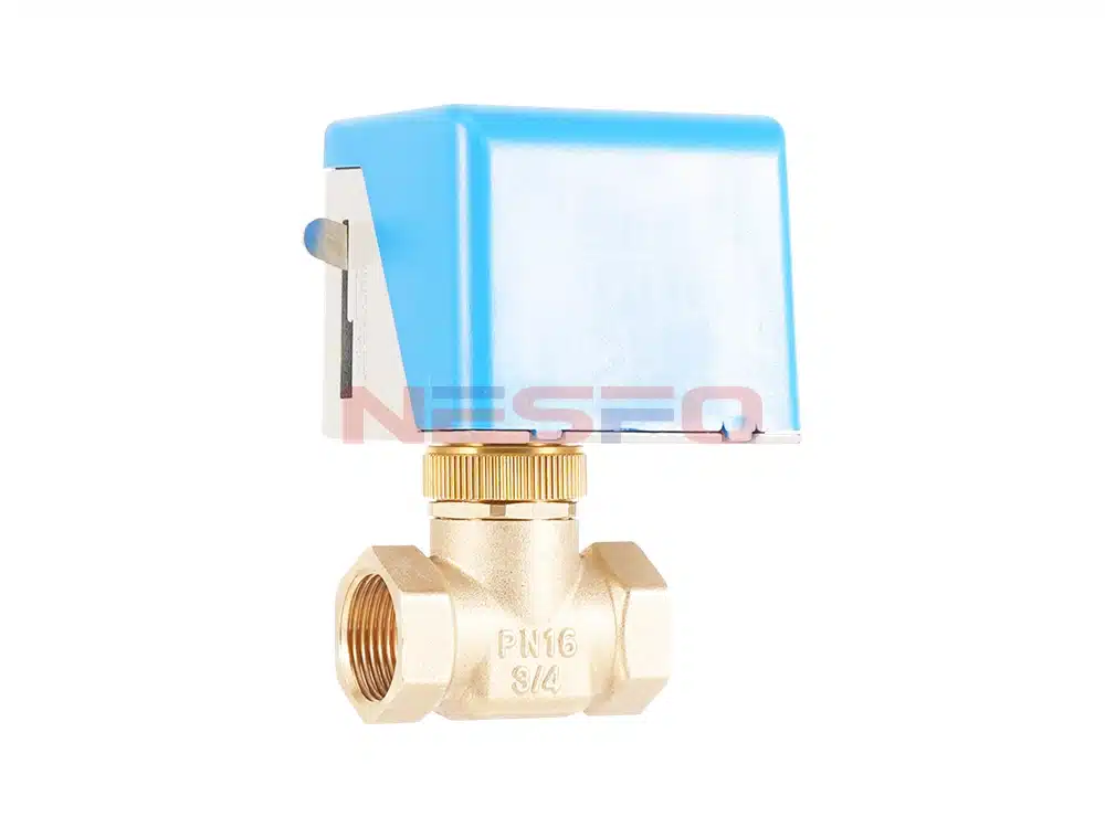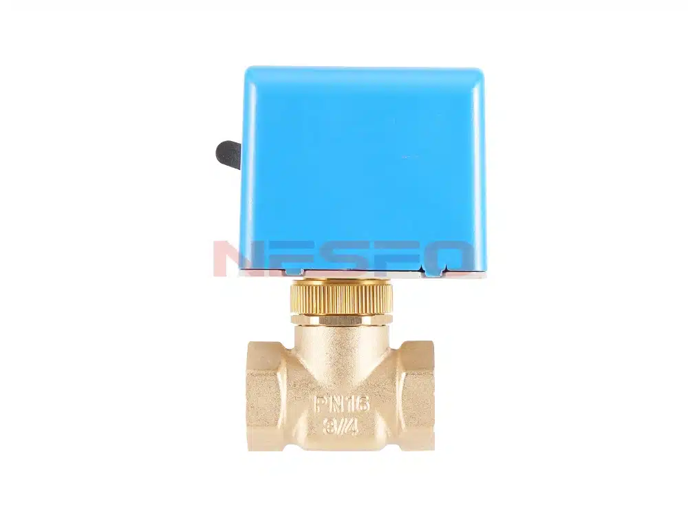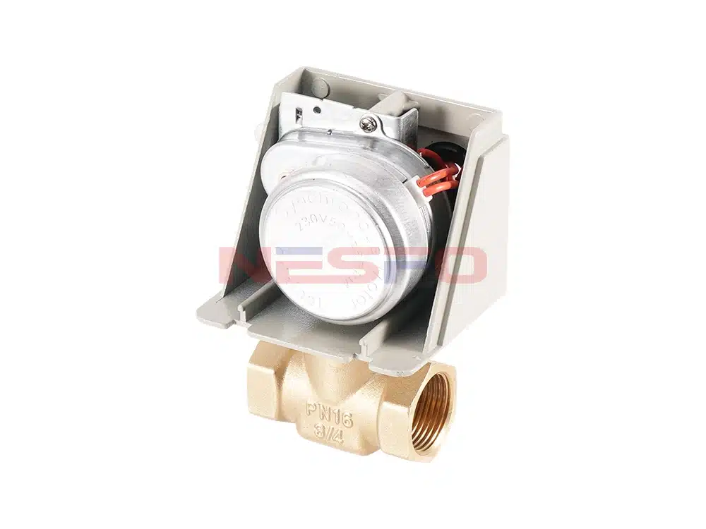 La válvula eléctrica de dos vías de la serie VA7010 consta de un actuador de válvula de la serie VA7010 y una válvula de dos vías de cobre. Se utiliza para controlar la apertura o el cierre de las tuberías de aire acondicionado de agua fría o caliente, lo que permite regular la temperatura ambiente. El actuador es accionado por un motor síncrono de cinta magnética unidireccional, con la válvula accionada por resorte. La válvula permanece normalmente cerrada cuando está inactiva. Al recibir una señal de activación del termostato, la válvula solenoide conecta su fuente de alimentación de CA para abrirse. A continuación, el agua fría o caliente fluye hacia la unidad fan coil, proporcionando refrigeración o calefacción a la habitación. Cuando la temperatura ambiente alcanza el punto de consigna del termostato, este desactiva la válvula solenoide. El mecanismo de retorno por resorte cierra la válvula, deteniendo así el flujo de agua hacia la unidad fan coil. Al cerrar o abrir la válvula, la temperatura de la habitación se mantiene constantemente dentro del rango establecido por el termostato.