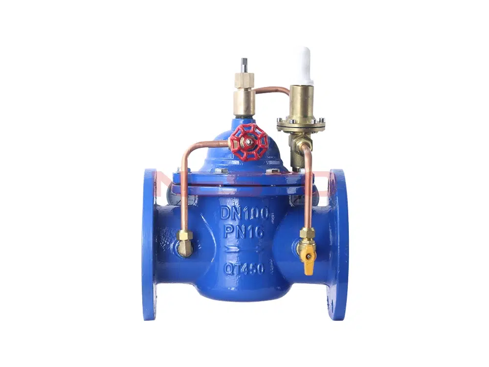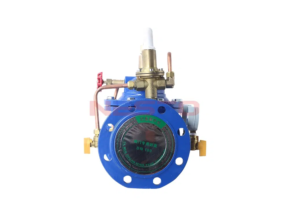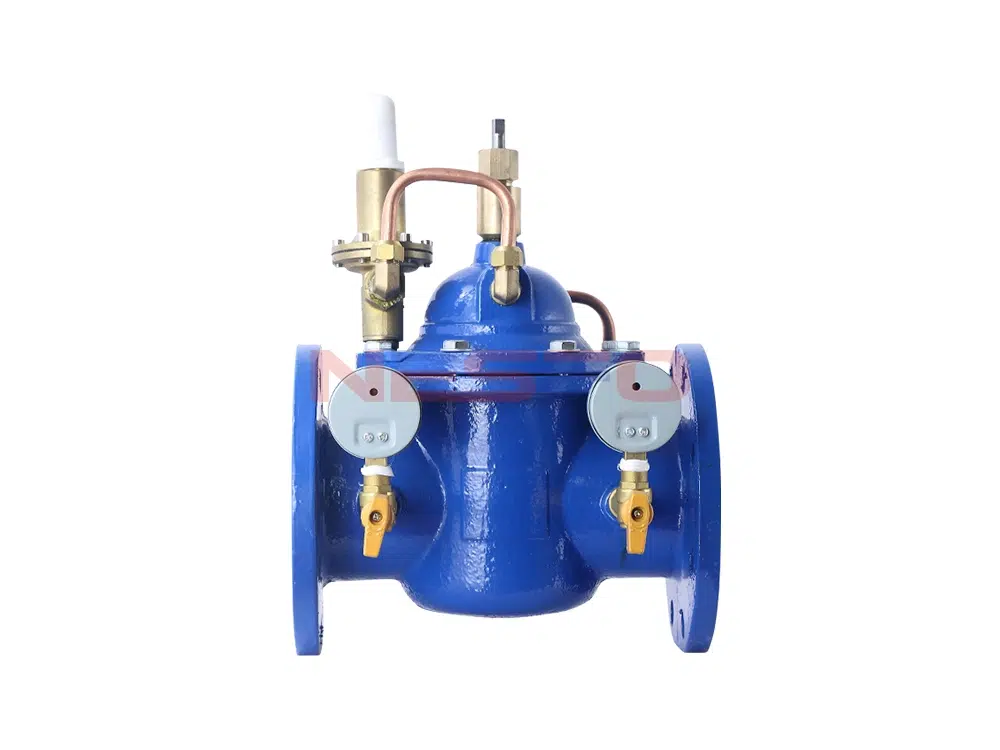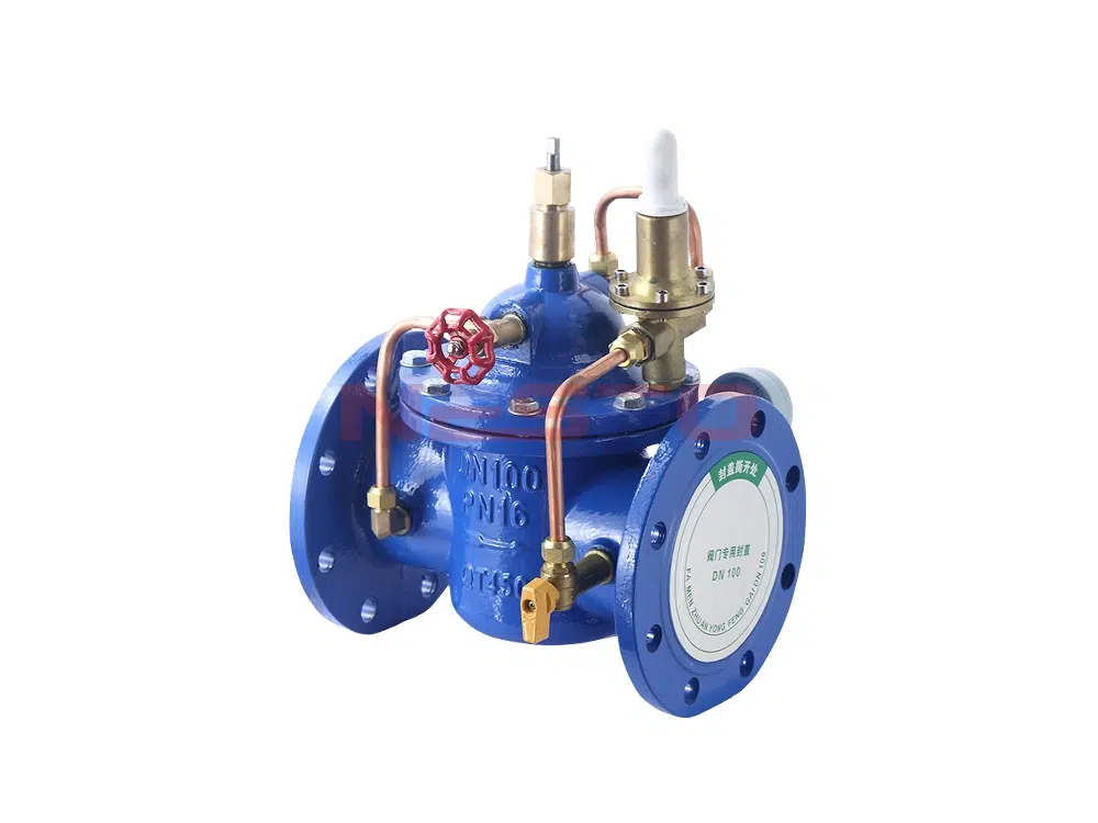 当阀门从进口端给水时,水流过针阀进入主阀控制室,并经过导阀、球阀流出主阀控制室到出口,此时主阀处于全开或浮动状态。调定主阀上部的流量调节阀,可为主阀设定一定开度。调节针阀开度和调节导阀弹簧压力,即可使主阀开度保持在设定开度,并在压力变化时导阀进行自动调节,保持流量不变。