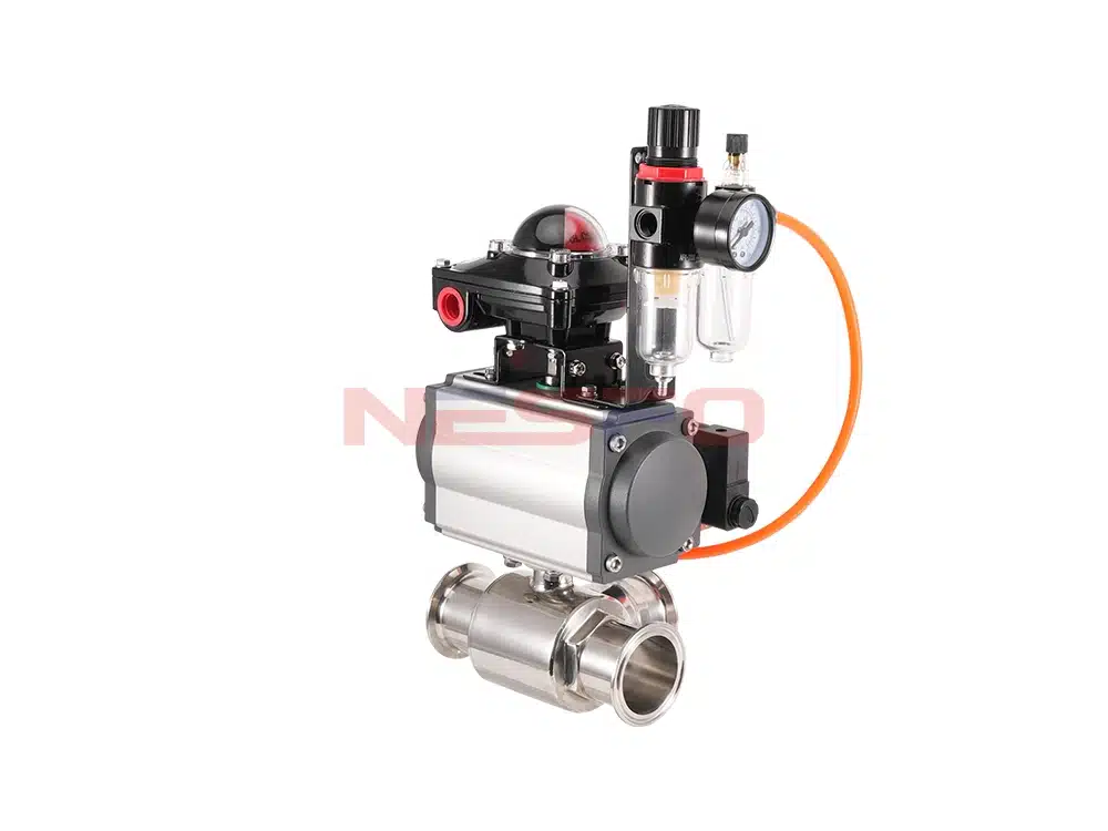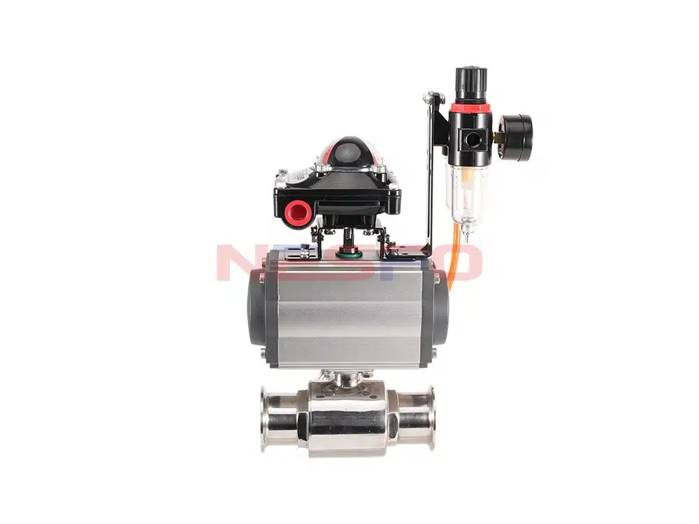 Q684F-10P пневматикалық жылдам қосылатын үш жоллы шар клапаны пневматикалық тоқсан айналымды қозғалтқыш пен санитарлық шар клапаны жинағынан тұрады. Клапан корпусы дәл өңделген тот баспайтын болаттан жасалған, ішкі ағын жолы 0,5 мкм (240 grit) электрополирленген беттерімен кедергісіз сұйық ағынды қамтамасыз етеді. Толықтай қапталған PTFE тығыздау беттері өлі бұрыштарды жояды, мұқият тазалауды жеңілдетеді және гигиеналық тұтастықты қамтамасыз етеді. Бұл пневматикалық жылдам қосылатын үш жолды шар клапаны сыра өндірісінде, азық-түлік өнімдерін өңдеуде, химиялық инженерлік саласында, фармацевтика өндірісінде, биотехнологияда және су тазарту инженериясында кеңінен қолданылады.