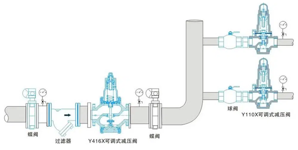 Y110X减压稳压阀是一种由阀体、阀盖、弹簧罩、主阀弹簧、活塞、O型圈、密封垫、调节弹簧和膜片等组成的常开型弹簧膜片式压力调节阀。它采用了阀后压力反馈机构,工作中既减动压、也减静压,既可水平安装,也可垂直安装。