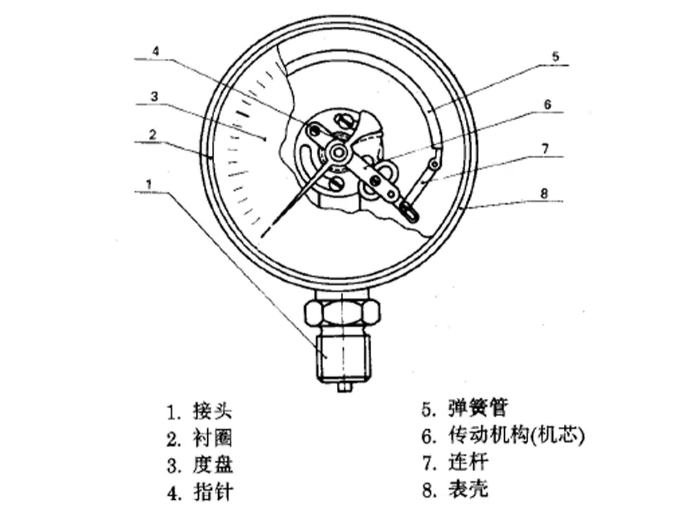 仪表的测量系统由接头、弹簧管和传动机构组成,通过指针指示仪表读数。当被测介质的压力通过接头传至压力表的弹簧时,弹簧管受压力的作用而产生弹性形变,从而带动传动机构及指针,此时指针在压力表表盘上指示的刻度值,即为被测介质的压力值。