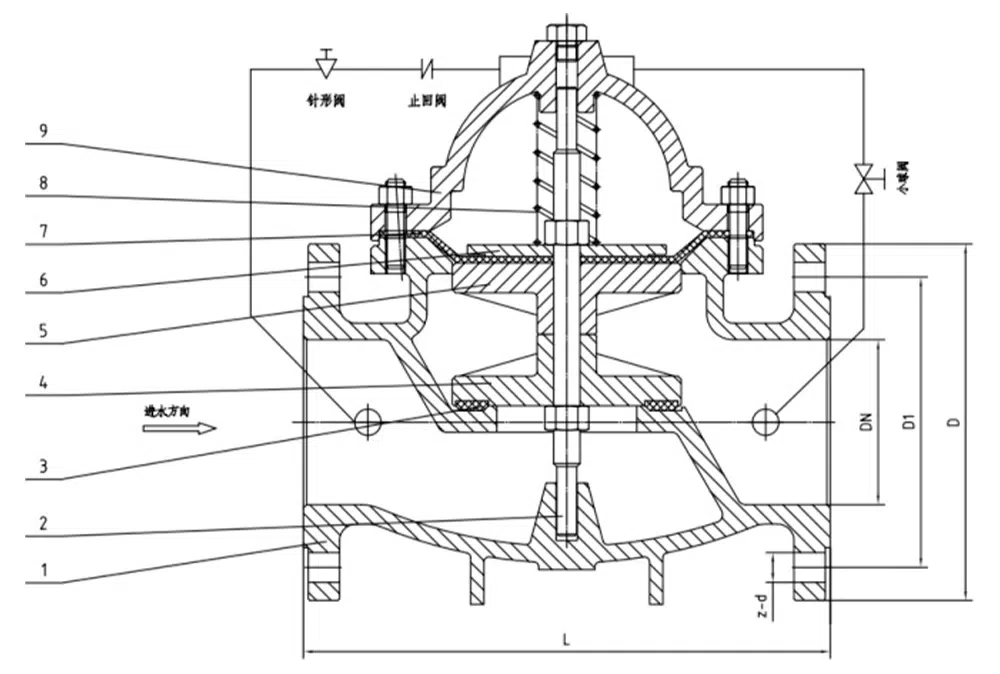 300X缓闭式止回阀由主阀、单向阀、针型阀、球阀、微形过滤器和压力表组成水力控制接管系统。利用水力自动操作,可使主阀得到迅速的开启或缓慢的关闭速度。防止水锺水击的产生,以达到缓闭消声的效果。当缓闭止回阀从进口端给水时,水通过微形过滤器、针型阀、单向阀进入主阀控制室,再经过球阀排水至下游。因为针型阀开度小于球阀开度,即主阀控制室的排水速度大于进水速度,因此控制室压力降低,作用于主阀盘下端的进口压力打开主阀向下游供水。当管道停止供水时,若下游水开始回流,一部分回流水经球阀进入主控制室,由于单向阀作用,回流水不能从主控制室流出,引起主控制室逐渐升压,缓缓关闭主阀。