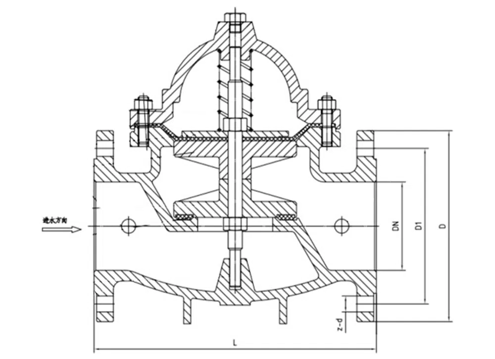 当阀门从阀前端给水时,水流流过针阀进入主阀控制室,当电磁导阀打开时,控制室内的水经电磁导阀、球阀流出。球阀开度大于针阀开度,主阀控制室内压力很低,主阀处于全开状态。当电磁导阀关闭时,主阀控制室的水不能流出,控制室升压,推动膜片关闭主阀。