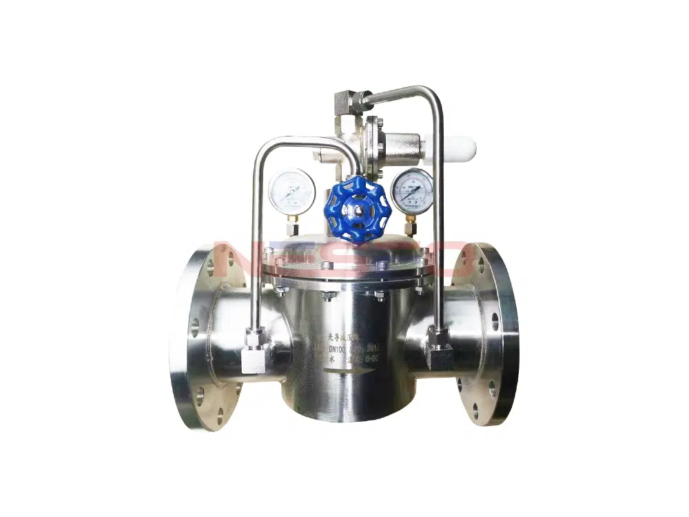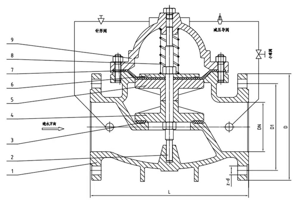 当阀门从进口端给水时,水流过针阀进入主阀控制室,出口压力通过导管作用到导阀上。当出口压力高于导阀弹簧设定值时,导阀关闭。控制室停止排水,此时主阀控制室内压力升高并关闭主阀,出口压力不再升高。当阀门出口压力降到导阀弹簧设定压力时,导阀开启,控制室向下游排水。由于导阀系统排水量大于针阀的进水量,主阀控制室压力下降。进口压力使主阀开启。在稳定状态下,控制室进水、排水相同,主阀开度不变,出口压力稳定。调节导阀弹簧即可设定出口压力。