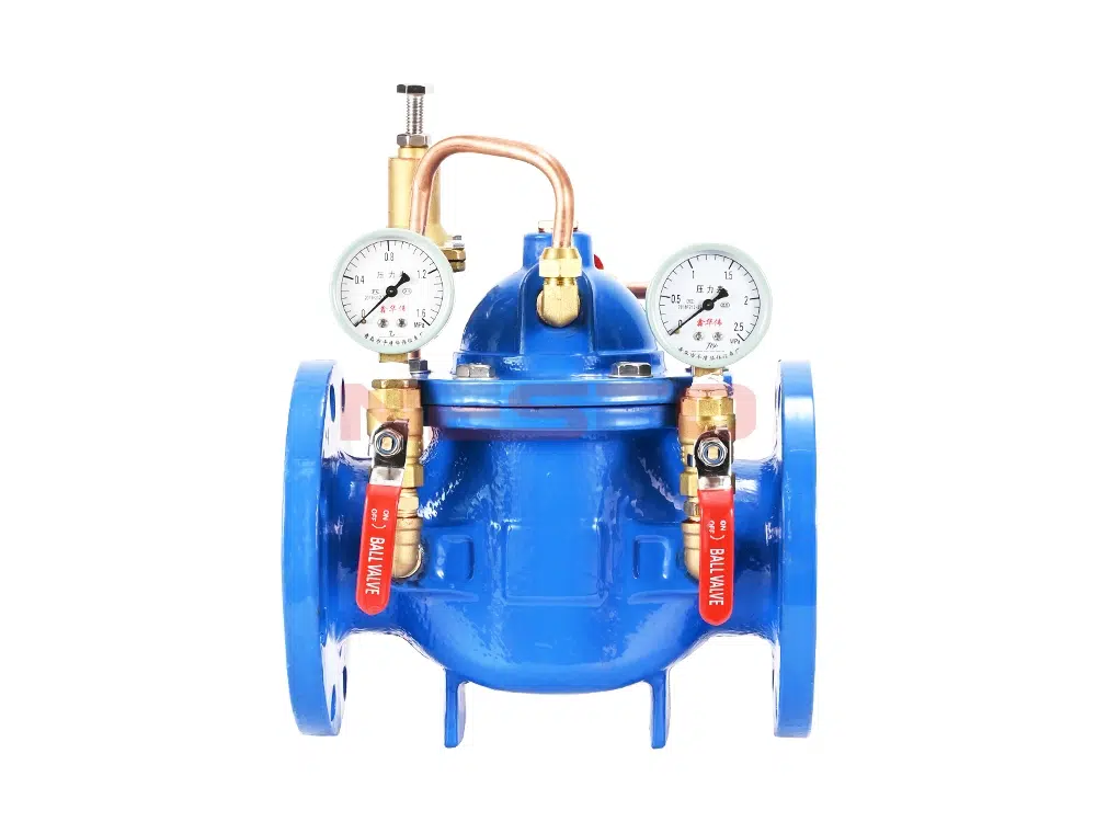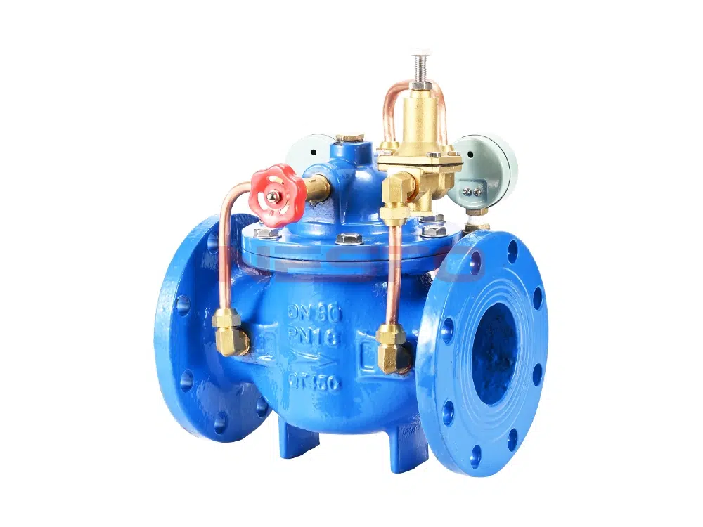 วาล์วลดแรงดันแบบปรับได้ 200X ประกอบด้วยระบบท่อควบคุมไฮดรอลิกซึ่งประกอบด้วยวาล์วหลัก วาล์วนำร่อง วาล์วเข็ม วาล์วลูกบอล ไมโครฟิลเตอร์ และเกจวัดแรงดัน เมื่อตั้งค่าแรงดันขาออกแล้ว ระบบจะรักษาแรงดันขาออกให้คงที่โดยอัตโนมัติ ผลิตภัณฑ์นี้ใช้การควบคุมวาล์วนำร่องแบบทำงานด้วยตนเอง โดยไม่ต้องใช้อุปกรณ์หรือแหล่งพลังงานเพิ่มเติม ผลิตภัณฑ์นี้มีการบำรุงรักษาที่ง่ายดาย มีความแม่นยำในการควบคุมแรงดันสูง มีผลกระทบจากแรงดันขาเข้าและอัตราการไหลน้อยที่สุด และมีการลดแรงดันและการรักษาแรงดันที่เชื่อถือได้ชุดวาล์วนี้มีการใช้งานอย่างแพร่หลายในระบบเครือข่ายการจ่ายน้ำสำหรับอาคารสูง, พื้นที่อยู่อาศัย, และโครงการจ่ายน้ำประปาของเทศบาล.