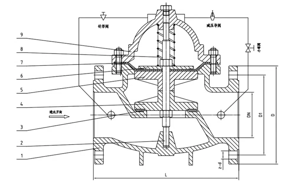 เมื่อมีการจ่ายน้ำเข้าสู่ตัววาล์วจากด้านทางเข้า น้ำจะไหลผ่านวาล์วเข็มเข้าสู่ห้องควบคุมของวาล์วหลัก แรงดันที่ทางออกจะกระทำต่อวาล์วควบคุมผ่านท่อ เมื่อแรงดันที่ทางออกสูงกว่าค่าที่ตั้งไว้ของสปริงวาล์วควบคุม วาล์วควบคุมจะปิด การระบายน้ำออกจากห้องควบคุมจะหยุดลง ทำให้แรงดันภายในห้องควบคุมของวาล์วหลักเพิ่มขึ้นและปิดวาล์วหลัก ส่งผลให้แรงดันที่ทางออกหยุดเพิ่มขึ้นเมื่อแรงดันที่ทางออกลดลงถึงแรงดันที่ตั้งไว้ของสปริงวาล์วควบคุมหลัก วาล์วควบคุมหลักจะเปิดขึ้น ทำให้ห้องควบคุมระบายออกทางด้านล่าง เมื่อการระบายของระบบวาล์วควบคุมหลักเกินปริมาณการไหลเข้าของวาล์วเข็ม แรงดันในห้องควบคุมวาล์วหลักจะลดลง แรงดันที่ทางเข้ามีผลให้วาล์วหลักเปิดขึ้น ในสภาวะคงที่ ปริมาณการไหลเข้าและไหลออกของห้องควบคุมจะเท่ากัน การเปิดของวาล์วหลักจะคงที่ และแรงดันที่ทางออกจะคงที่ การปรับสปริงวาล์วควบคุมหลักจะตั้งค่าแรงดันที่ทางออก