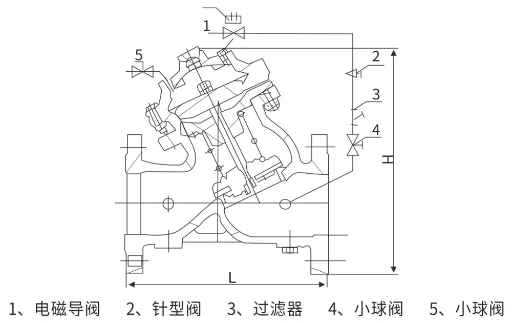 J145X隔膜式电动遥控阀由主阀和调节阀及接管系统组成,阀体采用直流式阀体,主阀控制室为膜片式或活塞式的双控制室结构,控制室比一般水力控制阀增加了一个,增加了对主阀的控制功能,实现了对水泵出口的缓慢开启、全开、缓闭、截止等多功能控制,实现了一个阀门、一次调节对水泵出口的多功能控制。