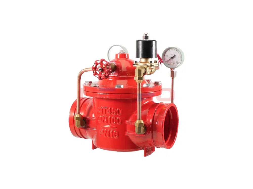 G600X沟槽式电动控制阀由主阀、电磁导阀、针阀、球阀、微形过滤器和压力表组成水力控制接管系统。通过电磁导阀可以实现对阀门开启和关闭的遥控。加装附加装置后,可控制开启和关闭的速度。电控水力控制阀利用导阀控制阀门的开启和关闭,节省能源。可代替其它阀门大型电动装置。电控水力控制阀产品用于高层建筑、生活区等供水管网系统及城市供水工程。G600X沟槽式电动控制阀是一种以电磁阀为向导阀的水力操作式阀门。常用于给排水及工业系统中的自动控制,控制反应准确快速,根据电信号遥控开启和关闭管路系统,实现远程操作。G600X沟槽式电动控制阀可取代闸阀和蝶阀用于大型电动操作系统。阀门关闭速度可调,平稳关闭而不产生压力波动。该阀门体积小、重量轻、维修简单、使用方便.电磁阀可选用交流电220V,或直流电24V,可根据场合选用常开或常闭型均可。