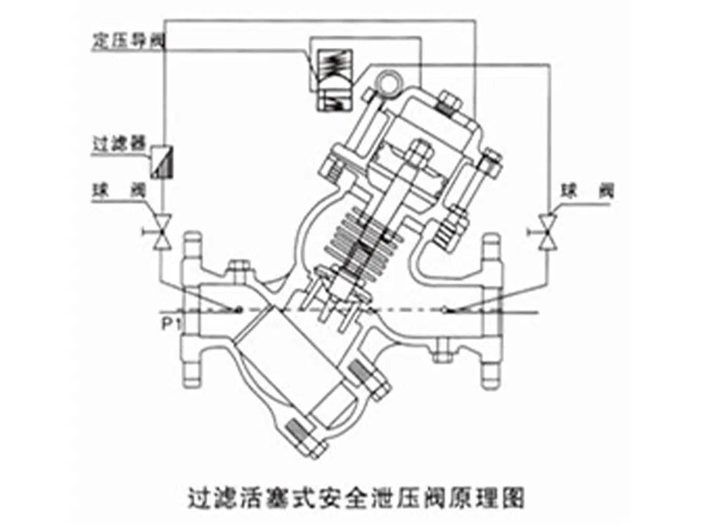 Yukarı akış basıncı P1, basınç ayar pilot valfi ve kontrol borusu aracılığıyla piston kontrol odasının üst kısmına girer; daha sonra basınç ayar pilot valfi aracılığıyla çıkışa gider. Konumlandırma pilot valfinin ayar vidasının ayarlanması, açılış basıncını ayarlayabilir, basınç ayarlanan değeri aştığında, sabit basınçlı pilot valf açılır ve ana valf de sistem basıncını serbest bırakmak ve sistemin güvenliğini sağlamak için açılır. Emniyet basıncı tahliye işlevini gerçekleştirmek için.