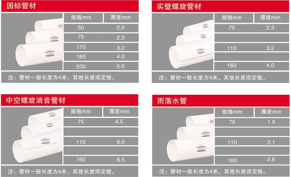 PVC-U排水管是技术成熟的排水管系列产品,在国内外已获得广泛应用。产品有铸铁管无以比拟的长久寿命、耐腐蚀等优点;在施工上更有重量轻便于搬运安装以及连接简易等特点,广泛应用于民用建筑排水排污、化工排水排污、排雨水等领域。PVC-U排水管管材、管件符合GB/T5836.1-2018和GB/T5836.2-2018的标准要求。产品有直管、扩直口管和扩凸口管三种形式,可使用多种管道连接方式。此外,公司还开发了用于排雨水的压力排水管和美观的方形雨落水管用于不同建筑的排雨水设计及工程;开发了可降低排水噪音的螺旋消音管、中空螺旋消音管以及中空壁消音管等系列排水管。