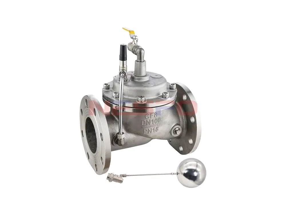 Khi đường ống cấp nước từ đầu vào, do van kim, van bi và van phao luôn mở, nước sẽ đi qua bộ lọc vi mô, van kim, phòng điều khiển, van bi và van phao để vào bể chứa. Lúc này, phòng điều khiển không tạo áp lực, van chính mở ra và bể chứa (bể) cấp nước. Khi mực nước trong tháp nước (bể chứa) dâng lên đến độ cao cài đặt, phao nổi lên và đóng van phao, áp suất nước trong phòng điều khiển tăng lên, đẩy van chính đóng lại và ngừng cấp nước. Khi mực nước giảm xuống, van phao mở lại, áp suất nước trong phòng điều khiển giảm xuống, van chính mở lại và tiếp tục cấp nước, duy trì độ cao cài đặt của mực nước.